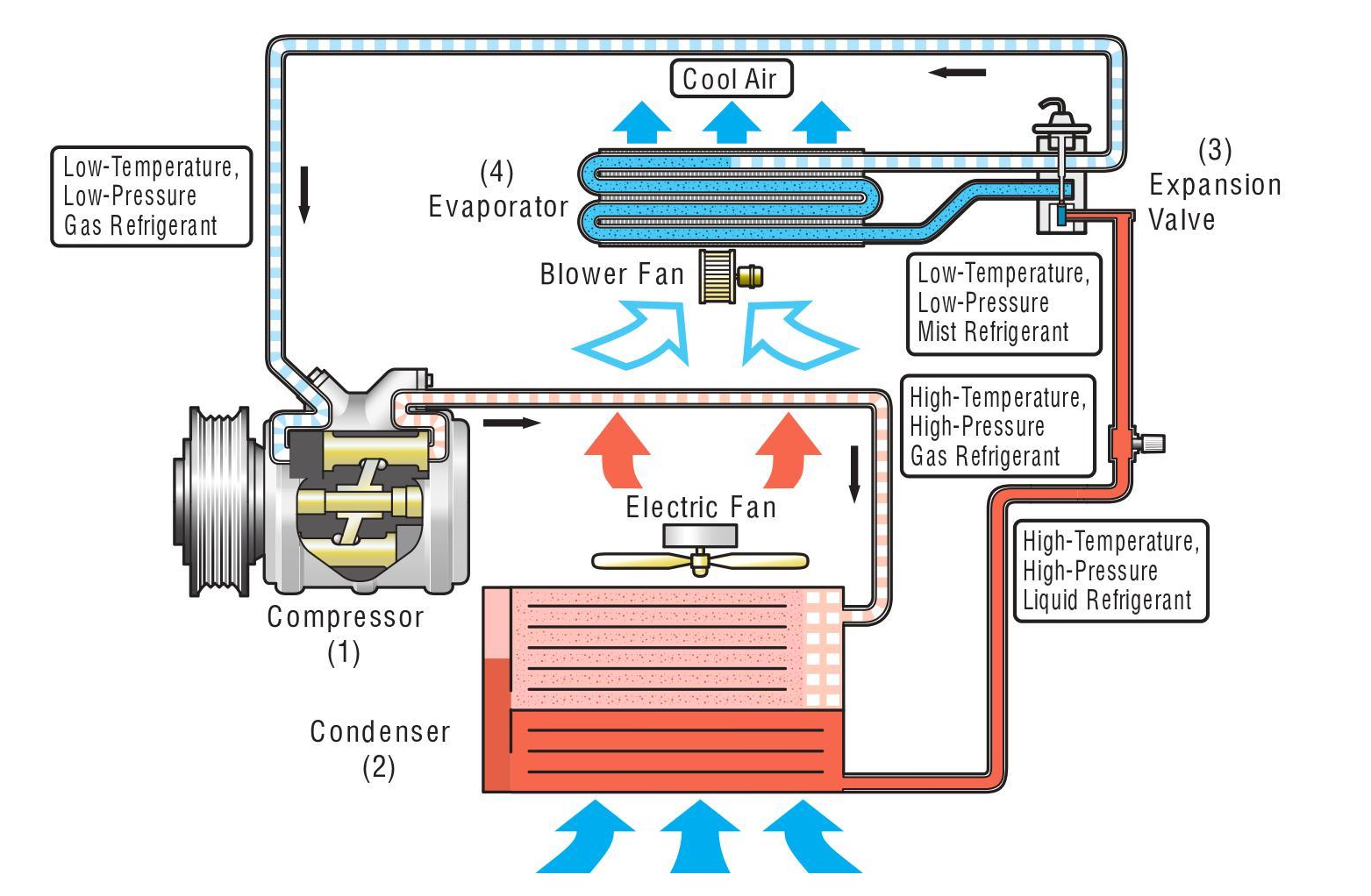 Evaporator – Absorbs heat from the cabin and cools the air.